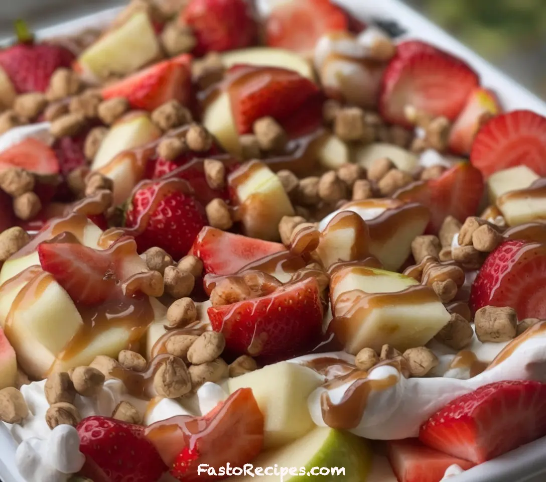 Enjoy a creamy, refreshing Cheesecake Fruit Salad with fresh fruit, caramel, and a crunchy topping! A simple, no-bake dessert that's perfect for any occasion.